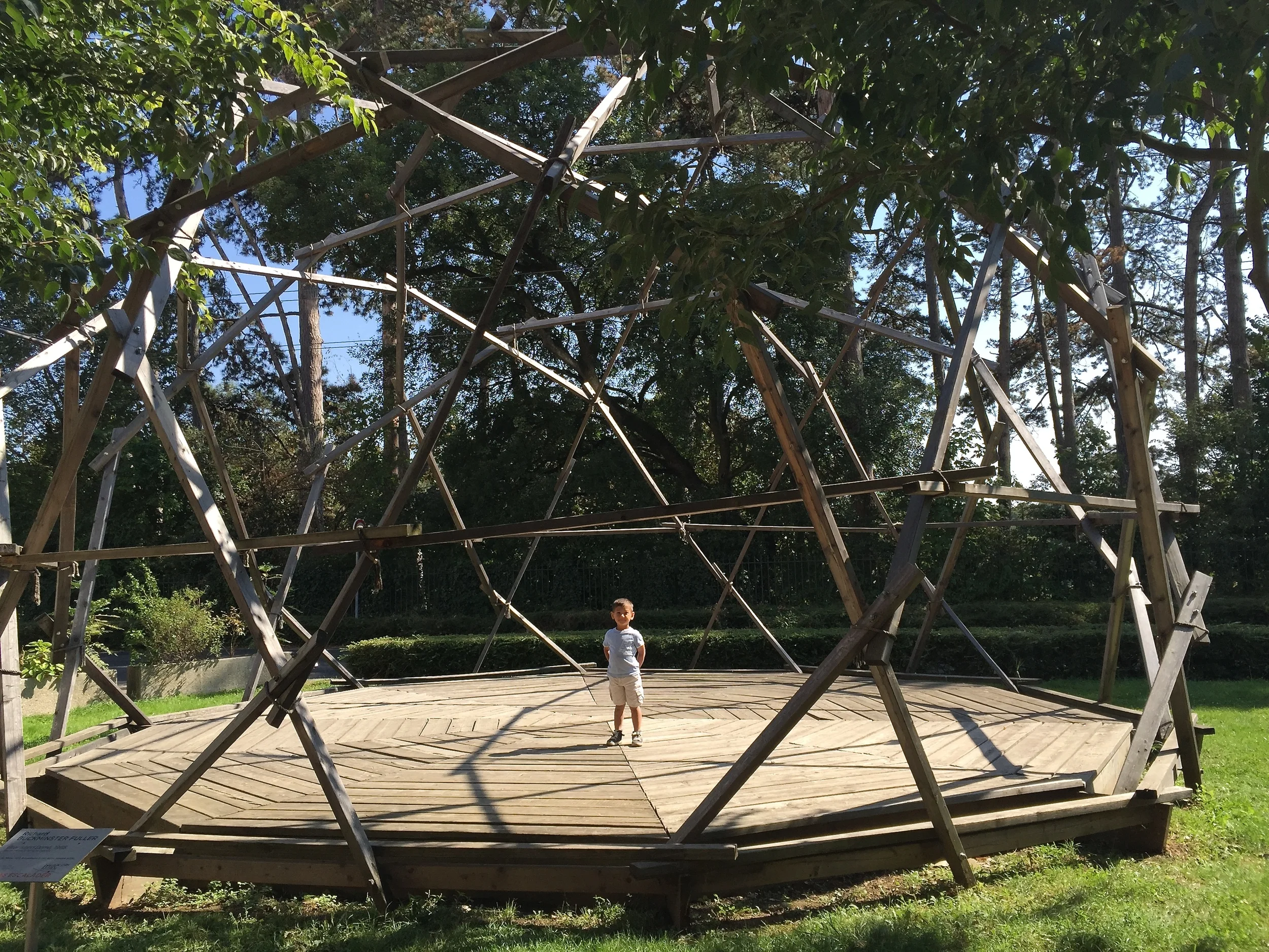 My son in a geometric dome near the Musée d'Art Contemporaine, Lyon, France